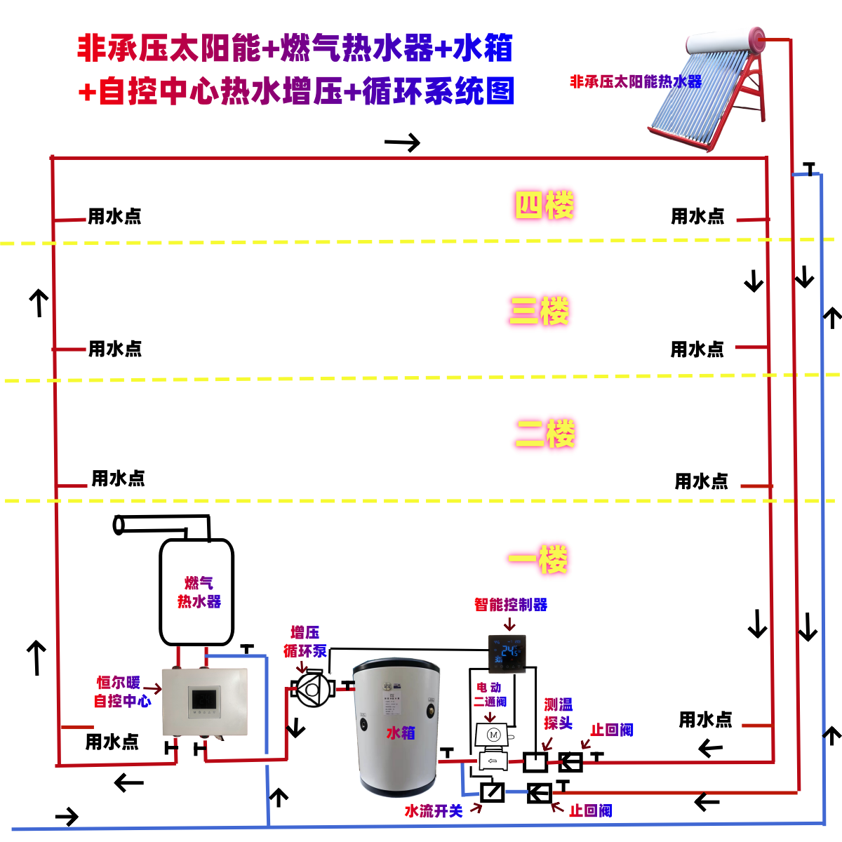 如果是非承压太阳能+燃气热水器组合的零冷水系统,把图中水箱看成是另外加的储能保温水温,把水箱处冷水管看成是太阳能的下水管即可。